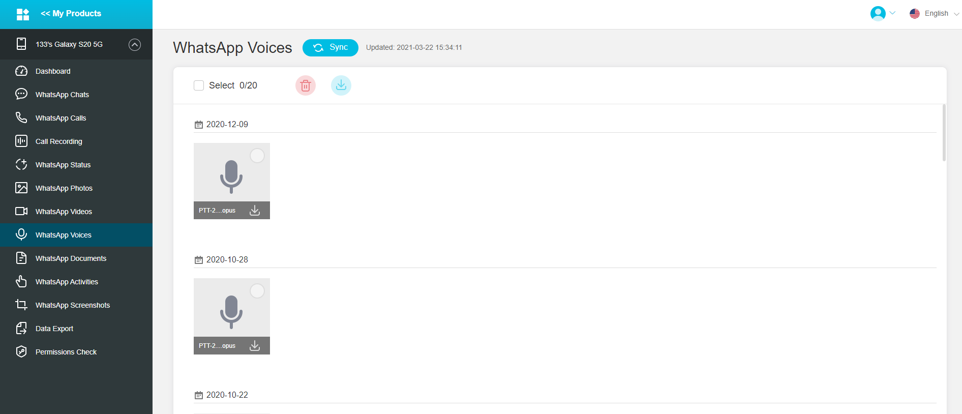 Click “WhatsApp Voices”, you can download or pre-listen the voice files of the target phone.